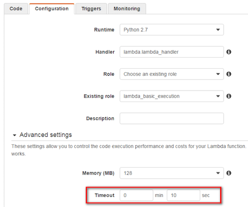 With this information, you can adjust your Lambda function timeout accordingly via the AWS Console (pictured above), or the AWS CLI, e.g.: