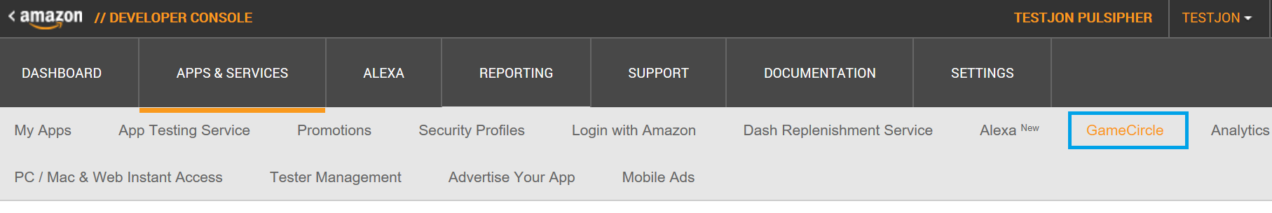 To use GameCircle in your game, you first need to create the application in the Appstore developer portal and then create your GameCircle configuration. Click on “Apps & Services” and then click on the “GameCircle” link, highlighted with the blue box, below. Click the button labeled “Add a configuration”.