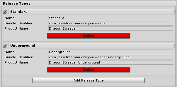 Advanced Builder is paid plugin on the Unity Asset store that allows you to set up individual builds based on target platforms and automate a lot of the tedious build steps. Once you have it installed you can create a new release type for the Underground build. Here you can see I have a Standard build and my Underground Build.