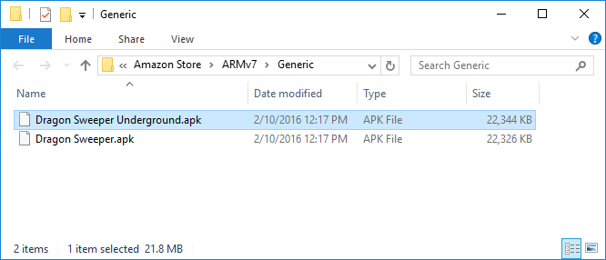 After we do our build, you’ll now have folder for each APK. Here you can see the Amazon Store folder contains our standard and Underground APKs.