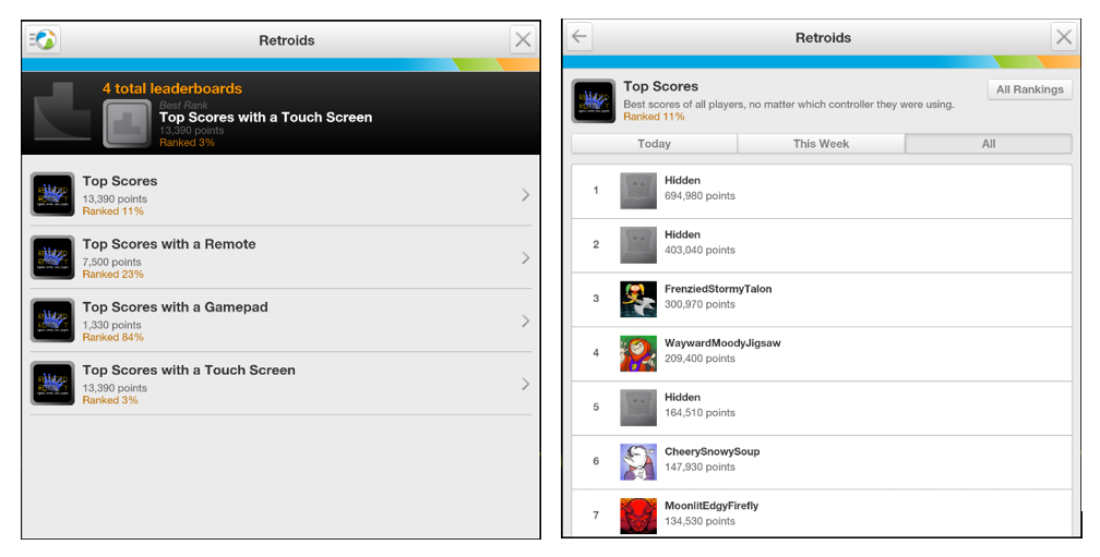 Figure 1 - List of leaderboards in Retroids and the Top Scores leaderboard