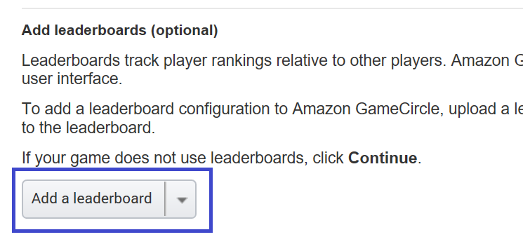 We’ll come back to Achievements in our next installment, but for now, click on the “0 draft / 0 published” text under “Leaderboards”. This will display the “Add Leaderboards” step. Click on the “Add Leaderboard” button, highlighted in blue in the picture below: