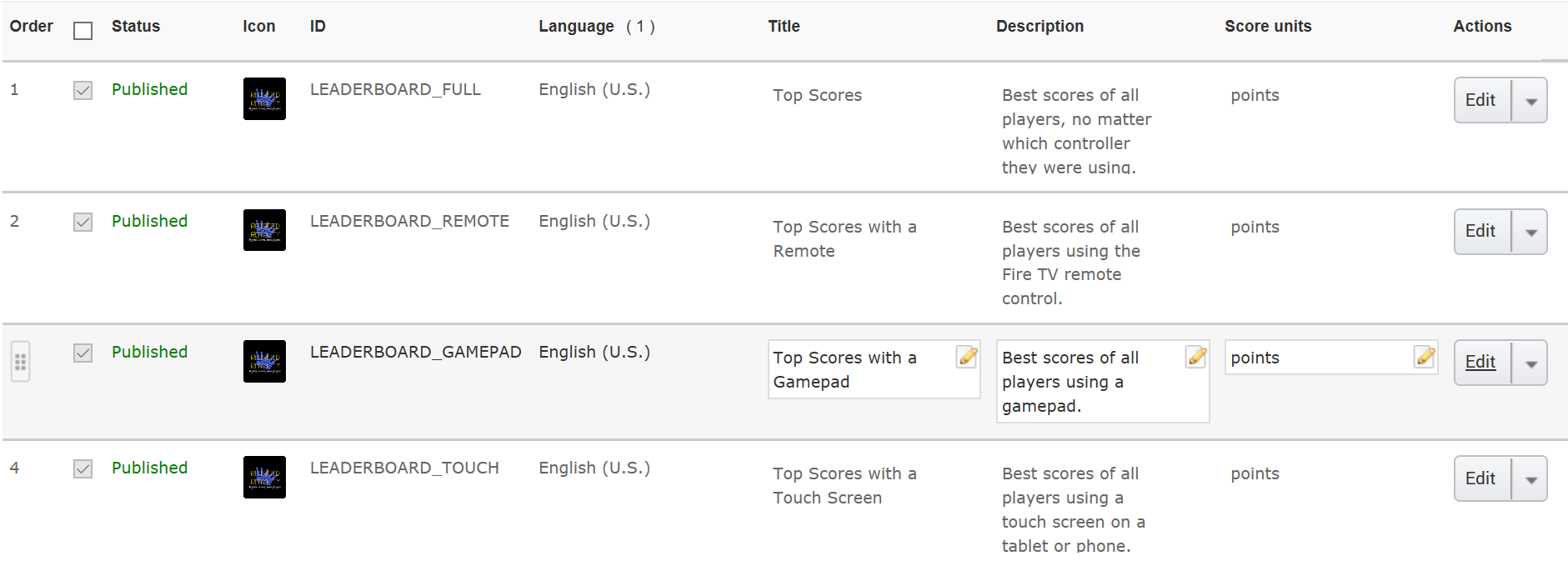 Now that we have GameCircle set up and Whispersync working, it’s time to bring out the competitive instincts of our players with leaderboards. Leaderboards are a staple in the gaming landscape and allow players to compare their scores with all the other people who have played the game today, this week, or ever. Depending on the nature of your game, you can have multiple leaderboards. Retroids has an overall leaderboard, as well as separate leaderboards for each type of control—touch, game controller or Amazon Fire TV remote control—to allow players to compare themselves against people who play the way they do. For another type of game, you might have just a single, overall leaderboard or leaderboards based on level, character class, or whatever makes sense.