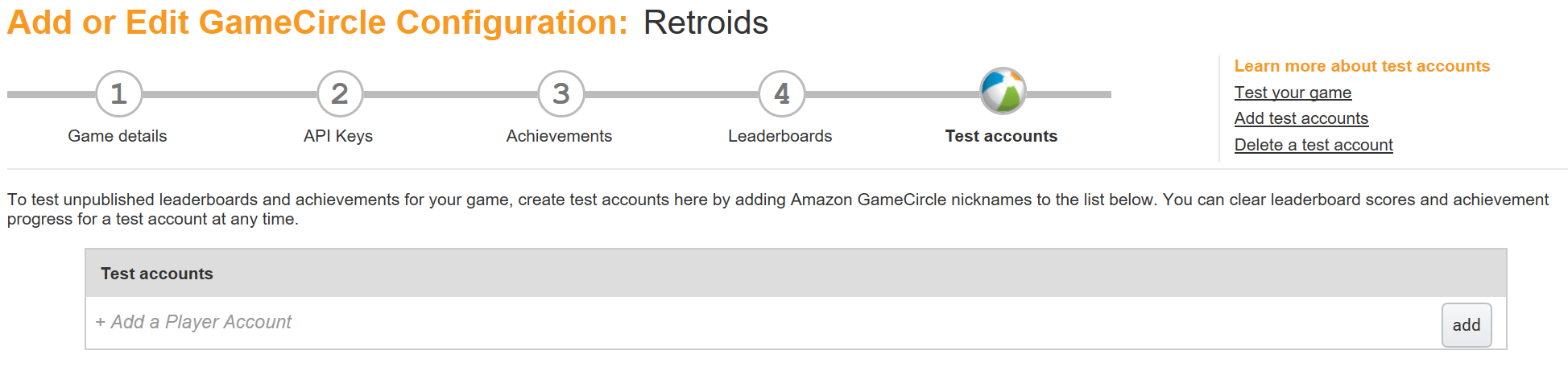 Enter these Test Accounts by clicking on the “Test Accounts” step of the GameCircle configuration and typing the GameCircle names where you see the text “Add a player Account” and click the “add” button.