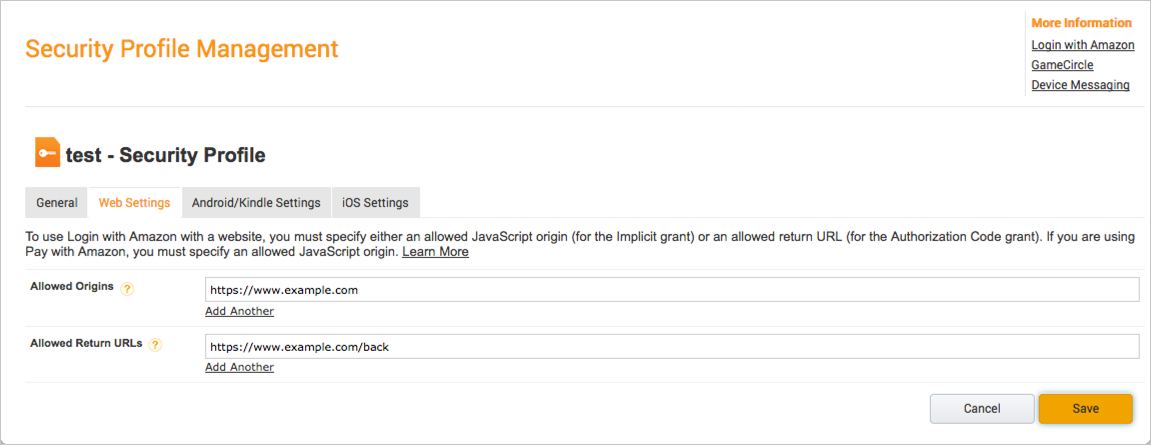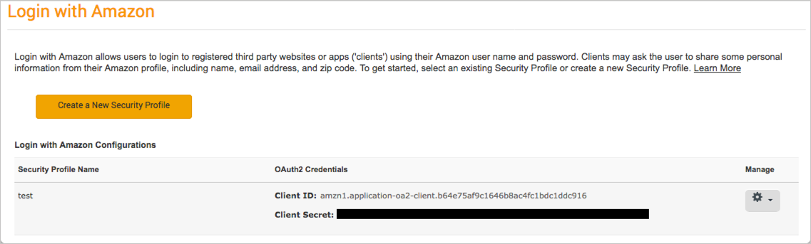 Login with Amazonコンソールに移動し、いずれかのセキュリティプロファイルを選択します。セキュリティプロファイルがない場合は、LwAセキュリティプロファイルの作成ガイドの手順に従って作成してください。
