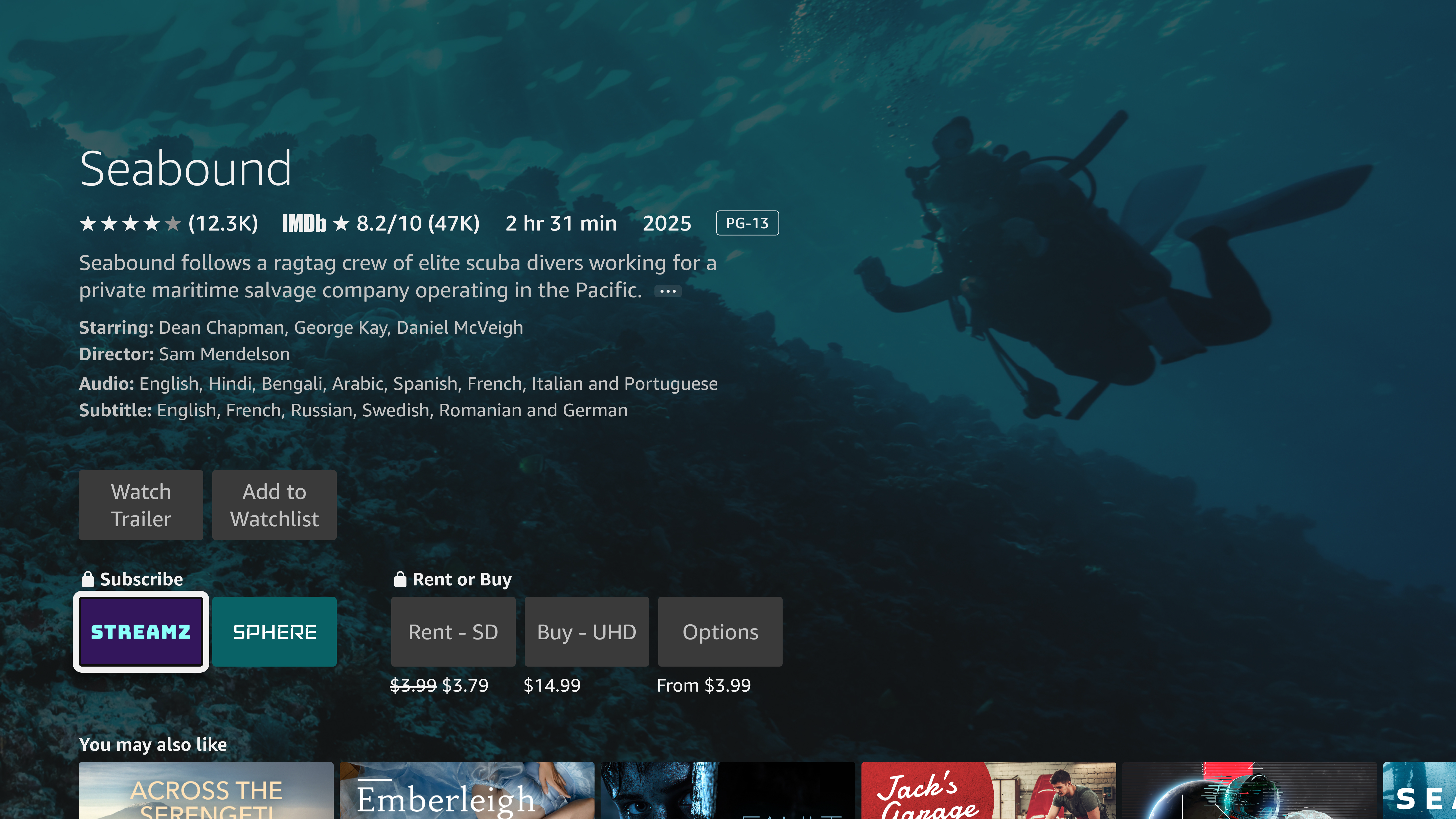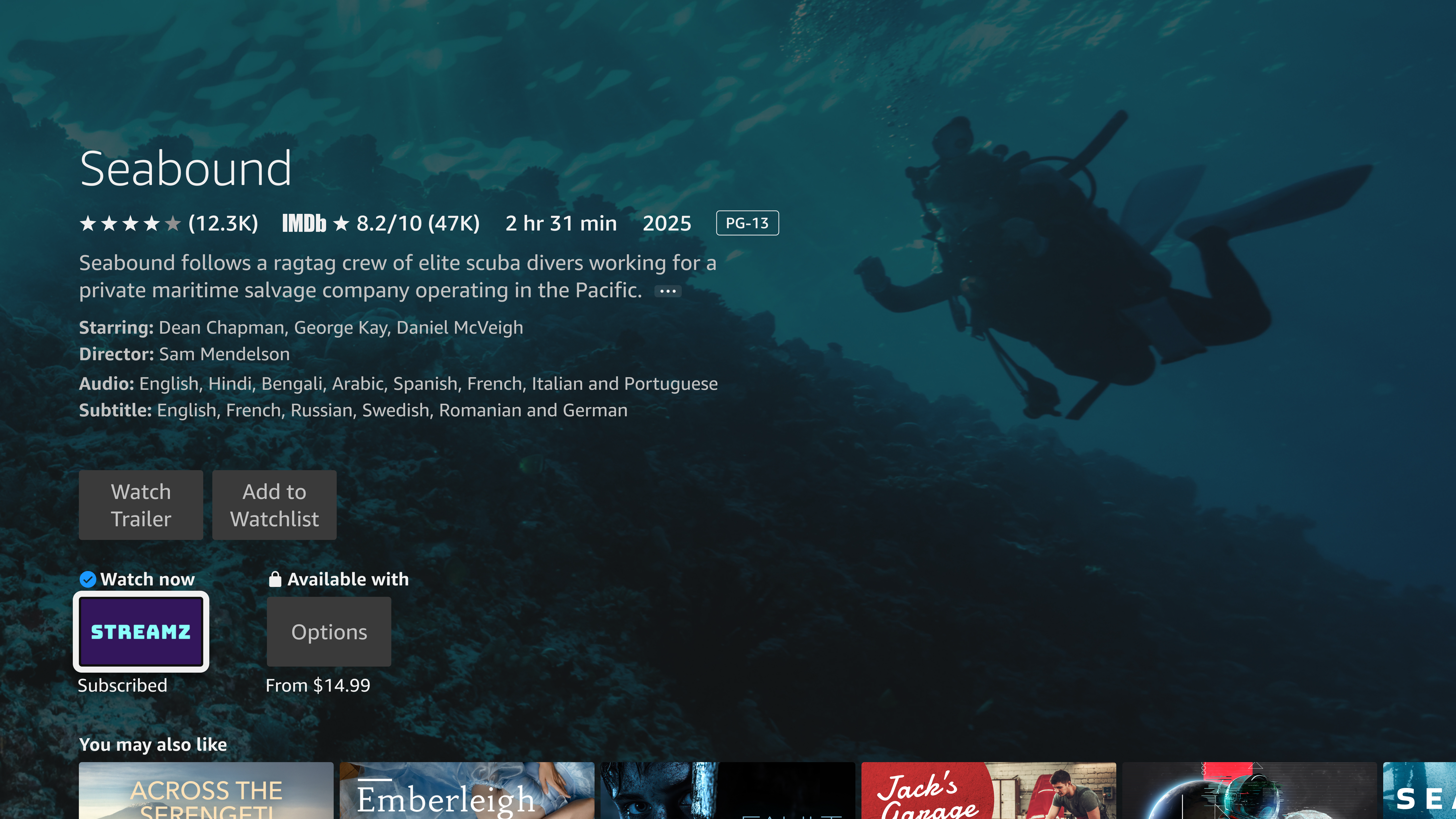 In the following example, the customer is entitled to watch Seabound in the Streamz app.
