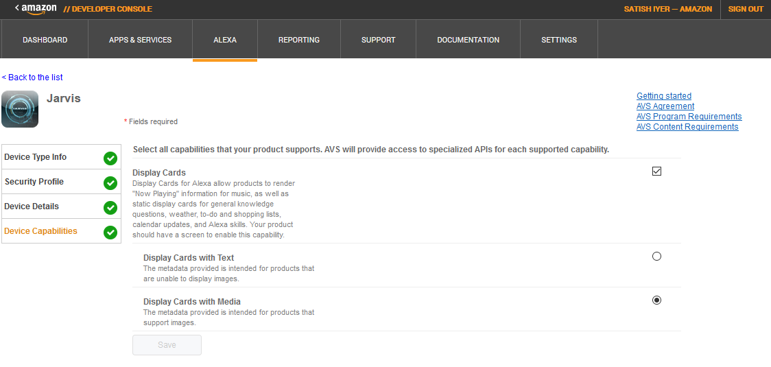 As a developer, you may be interested to know how AVS delivers the capability in the background. I recommend starting with the updated java sample app to prototype with this feature on a Raspberry Pi. Before you begin, login to the AVS Developer Portal and navigate to your registered product. Within that window, you’ll see the “Device Capabilities” tab – click on that tab to enable the Display Cards feature for your product.