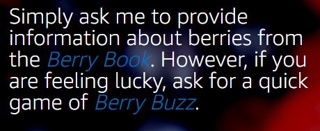 Who doesn’t love berries? Here we’ll use them as a foundation to build your next great Alexa skill. As you can imagine, the Berry Bash template is all about the tasty fruits. The first part of the sample skill provides users with information from the Berry Book via voice. It also lets users test their berry knowledge by playing a picture-based quiz in the form of Berry Buzz.