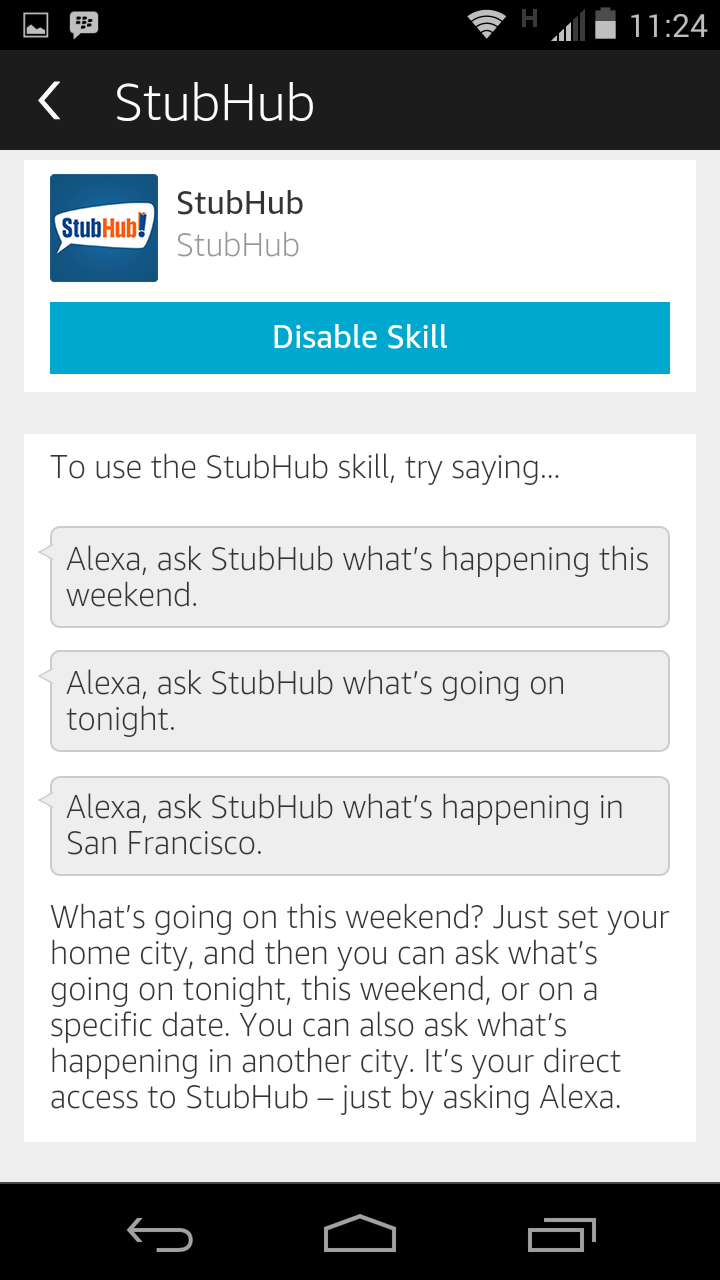 What’s going on this weekend? Just set your city, and then you can ask what’s going on tonight, this weekend or on a specific date. You can also ask what’s happening in another city. It’s your direct access to StubHub – just by asking Alexa.