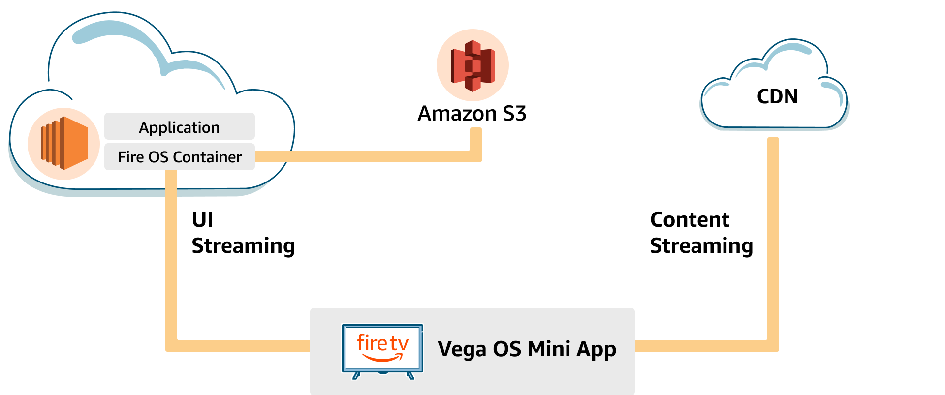このドキュメントでは、Vega OS Fire TVデバイス向けのAmazon Cloud Appストリーミングの技術的アーキテクチャと主要コンポーネントについて説明します。さらに、ユーザーインターフェイスをVega OS Fire TVデバイスにストリーミングする際に、Fire OSアプリをAWSクラウドコンテナで実行する方法について説明します。これには、ビデオの再生ワークフロー、コンテンツセキュリティ、アプリデータ処理も含まれます。また、このドキュメントには、アプリのネットワークトラフィックパターンと地域ごとのパフォーマンスに影響を与える、デプロイ時に地域によって考慮すべき事項とIPトンネリング設定オプションについても記載されています。