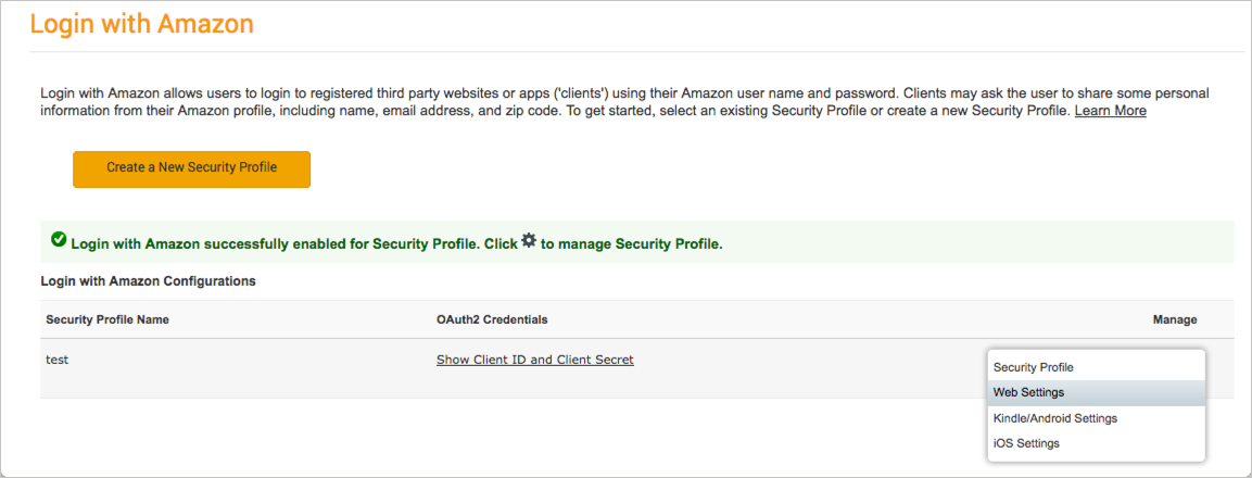 Login with Amazonコンソールに移動し、いずれかのセキュリティプロファイルを選択します。セキュリティプロファイルがない場合は、LwAセキュリティプロファイルの作成ガイドの手順に従って作成してください。
