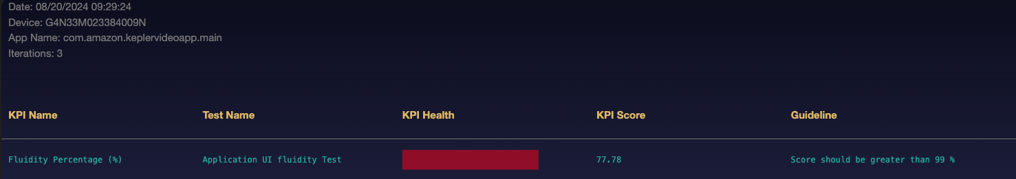 App KPI Visualizerがスクリプトを実行し、UIの滑らかさを測定します。次の図のようにUIの滑らかさKPIスコアが表示されます。