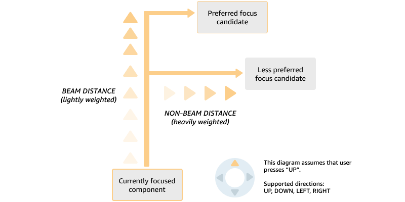 In layouts with a non-uniformly shaped item, when a user chooses a movement direction using the D-pad on the control, any element in the same general direction as the D-pad control event is a candidate to receive focus. The candidate which is the shortest weighted distance (distance along the input direction is weighted less heavily) is considered the next focused candidate.